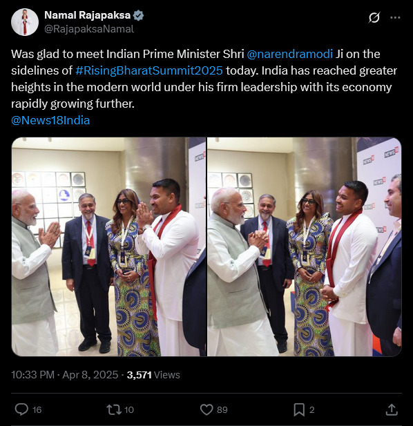 මෝදිගේ ස්ථිර නායකත්වය යටතේ ඉන්දියාව නූතන ලෝකයේ ඉහළ උසකට ළඟා වී ඇති බවත් එහි ආර්ථිකය වේගයෙන් වර්ධනය වෙමින් පවතින බවත් සිය X ගිණුමේ සටහනක් තබමින් නාමල් රාජපක්ෂ සඳහන් කළා.