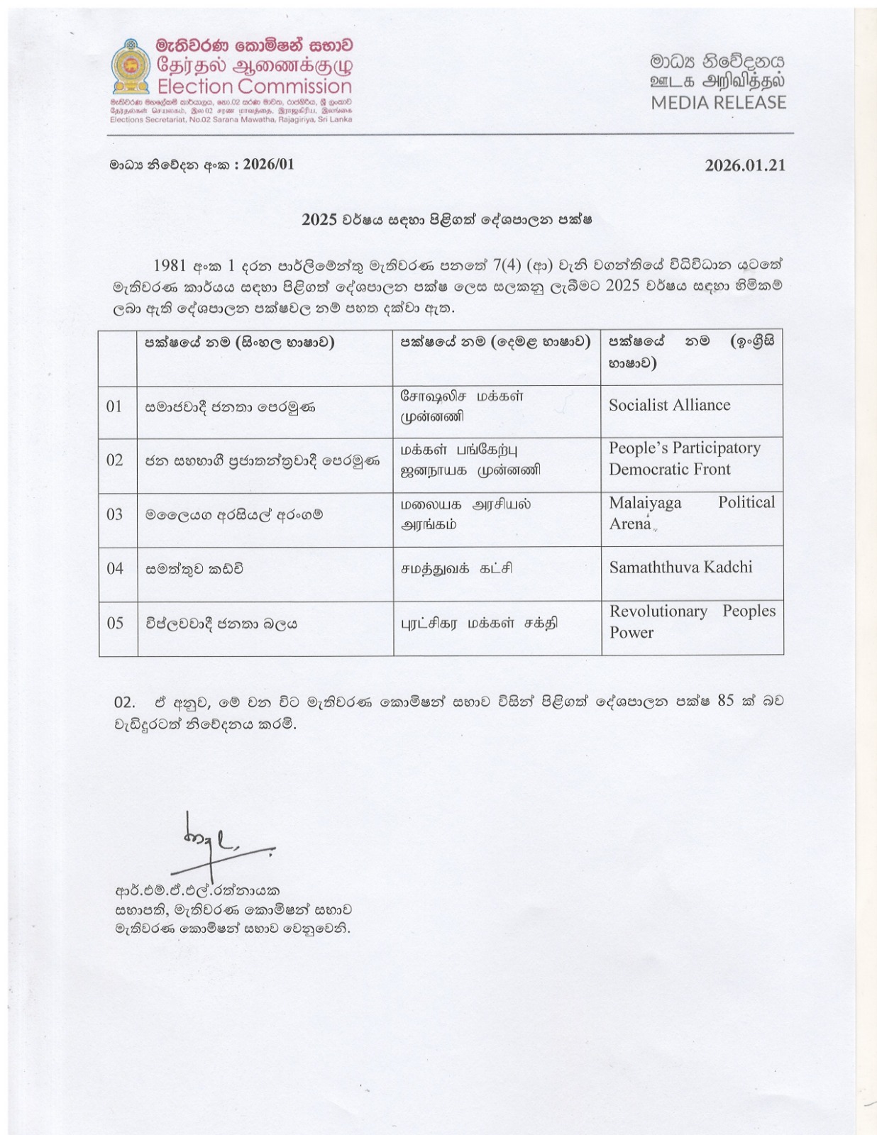 1981 අංක 01 දරන පාර්ලිමේන්තු මැතිවරණ පනතේ 7(4) (ආ) වැනි වගන්තියේ විධිවිධාන යටතේ මැතිවරණ කාර්ය සඳහා පිළිගත් දේශපාලන පක්ෂ ලෙස සලකනු ලැබීමට 2025 වර්ෂය සඳහා හිමිකම් ලබා ඇති දේශපාලන පක්ෂ මැතිවරණ කොමිෂන් සභාව විසින් ප්රකාශයට පත්කර තිබෙනවා.