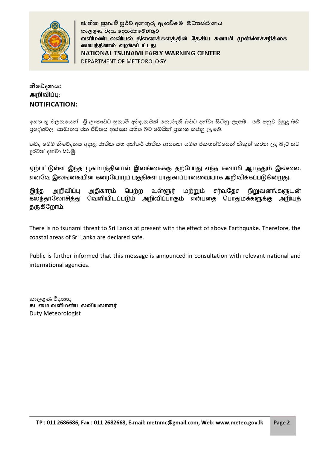 කෙසේ නමුත් එම දෙපාර්තමේන්තුව සඳහන් කළේ මුහුදු බඩ ප්රදේශ ආසන්නයේ සිටින ජනතාවට මේ පිළිබඳව සැලකිලිමත් වන ලෙසයි.