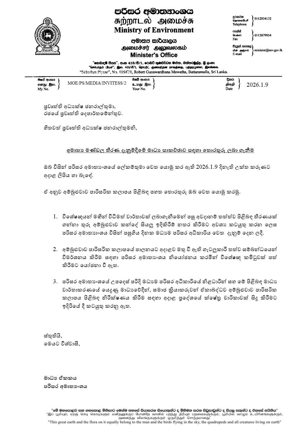 අම්බුළුවාව පාරිසරික කලාපයේ පාලනයට අදාළව මතු වී ඇති ගැටලුකාරී තත්ත්වය සම්බන්ධයෙන් විමර්ශන කිරීම සඳහා පරිසර අමාත්යාංශය නියෝජනය කරමින් විශේෂඥ කමිටුවක් පත්කිරීමට ද යෝජනා වී ඇති බව නිවේදනයක් නිකුත් කරමින් පරිසර අමාත්යාංශය සඳහන් කළා.