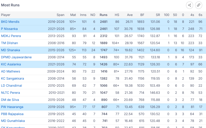 කුසල් මෙන්ඩිස් මේ වන විට ශ්රී ලංකා කණ්ඩායම වෙනුවෙන් ජාත්යන්තර T20 ලකුණු 2881ක් රැස් කර තිබෙනවා.