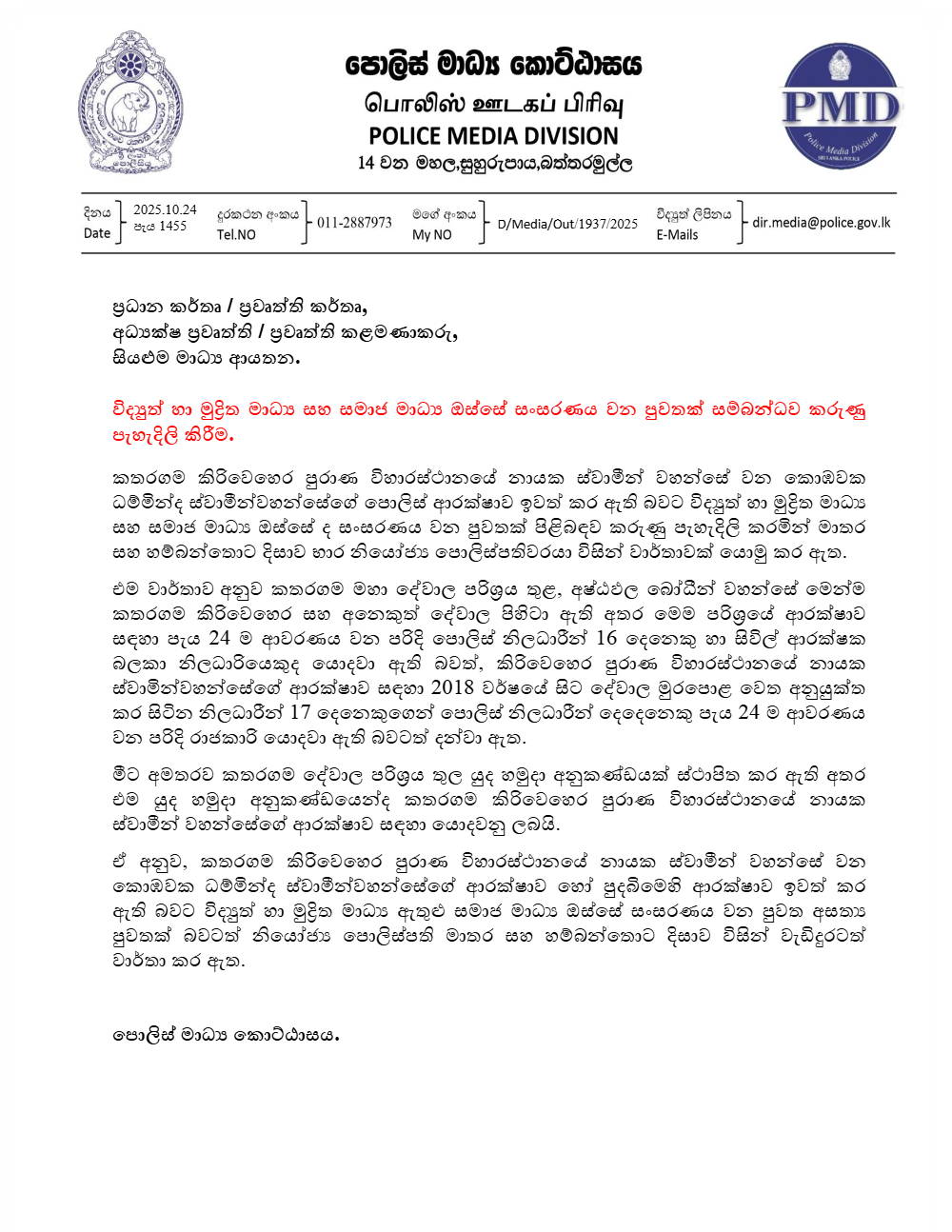 මේ සම්බන්ධයෙන් පොලීසිය නිකුත් කළ නිවේදනය පහතින්,