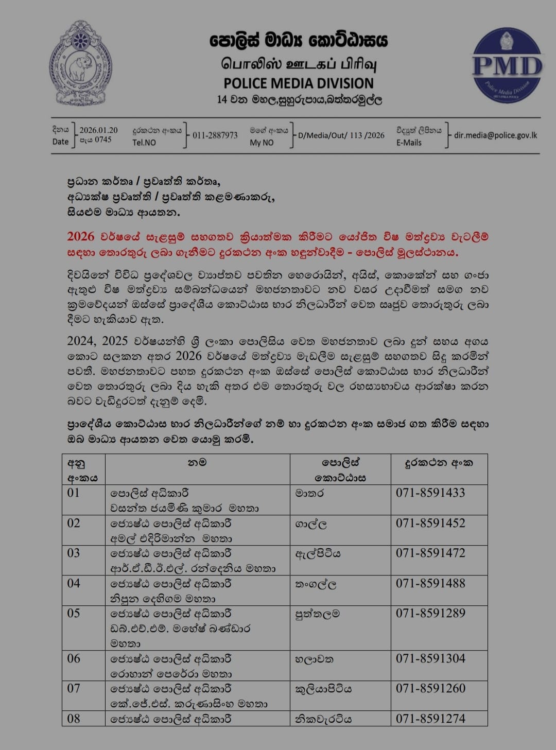 2026 වර්ෂයේ සැළසුම් සහගතව ක්රියාත්මක කිරීමට යෝජිත විෂ මත්ද්රව්ය වැටලීම් සඳහා තොරතුරු ලබා ගැනීමට පොලීසිය විසින් දුරකථන අංක කිහිපයක් හඳුන්වා දී තිබෙනවා.