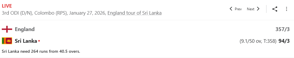 සංචාරක එංගලන්ත කණ්ඩායම සහ සත්කාරක ශ්රී ලංකා කණ්ඩායම අතර තීරණාත්මක අවසන් එක්දින තරගය මේ වන විට කොළඹ ආර්. ප්රේමදාස ක්රිකට් ක්රීඩාංගනයේදී පැවැත්වෙනවා.