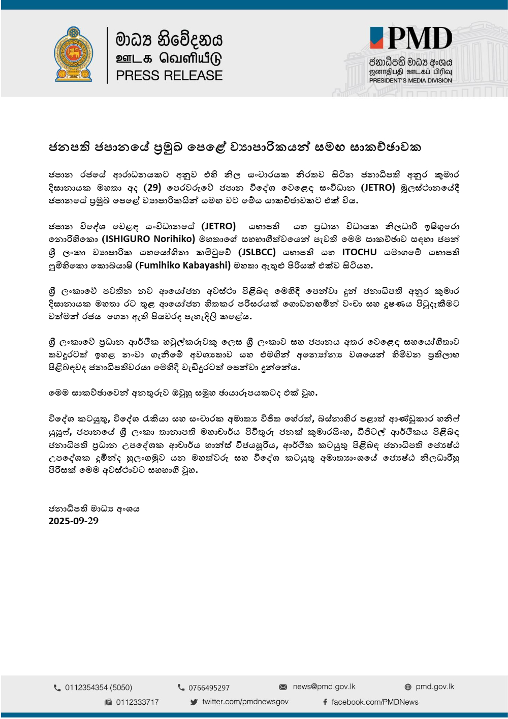 ජපාන රජයේ ආරාධනයකට අනුව එරට නිල සංචාරයක නිරතව සිටින ජනාධිපති අනුර කුමාර දිසානායක විසින් ජපාන විදේශ වෙළෙඳ සංවිධාන (JETRO) මූලස්ථානයේදී ජපානයේ ප්රමුඛ පෙළේ ව්යාපාරිකයන් සමඟ වට මේස සාකච්ඡාවකට එක්ව තිබෙනවා.