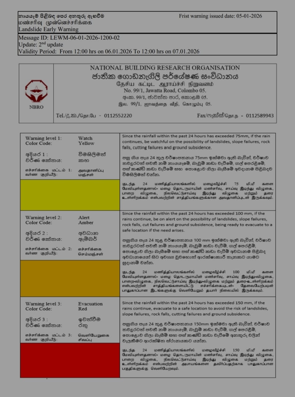 එමෙන්ම ජාතික ගොඩනැගිලි පර්යේෂණ සංවිධානය සඳහන් කළේ තවත් දිස්ත්රික්ක 4ක් සඳහා විමසිලිමත් වෙන ලෙස නායයෑම් අනතුරු අඟවා තිබෙන බවයි.