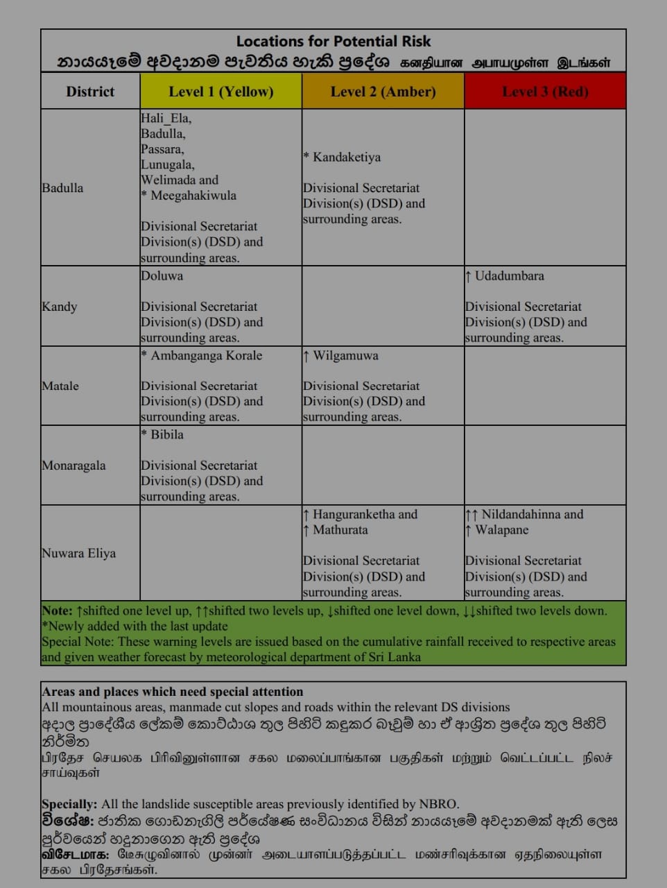 එම නිවේදනයේ සඳහන් වන්නේ මහනුවර දිස්ත්රික්යේ උඩුදුම්බර, නුවරඑළිය දිස්ත්රික්කයේ නිල්දණ්ඩාහින්න සහ වලපනේ යන ස්ථානවල නායයෑමේ අවධානම් පවතින බවයි.