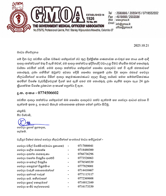 0774506602 එම දුරකථන අංකය බව රජයේ වෛද්ය නිලධාරින්ගේ සංගමය නිකුත් කළ නිවේදනයේ වැඩිදුරටත් සඳහන්.