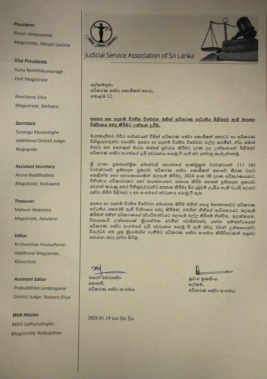 නිවේදනයක් නිකුත් කරමින් ශ්රී ලංකා නීතිඥ සංගමය සඳහන් කළේ මෙම සමාජ මාධ්ය සටහන් මඟින් පුද්ගලයන් නීතිපති ධූරයේ ස්වාධීනත්වයට අසාධාරණ ලෙස බාධා කිරීමට උත්සාහ දරන බවයි.