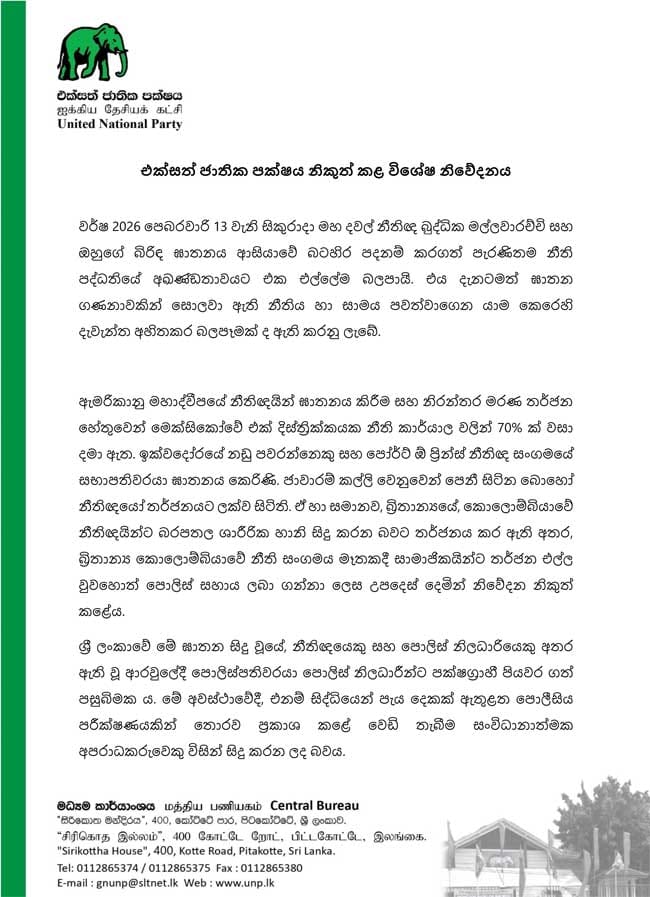 අකුරේගොඩදී නීතිඥවරයෙක්ට සහ ඔහුගේ බිරිඳට වෙඩි තබා ඝාතනය කිරීමේ සිද්ධිය ඇතුළුව නීතිය හා සාමය පිරිහීම සම්බන්ධයෙන් මහජන ආරක්ෂක සහ පාර්ලිමේන්තු කටයුතු අමාත්ය ආනන්ද විජේපාල වහාම ඉල්ලා අස්විය යුතු බව එක්සත් ජාතික පක්ෂය ප්රකාශ කළා.