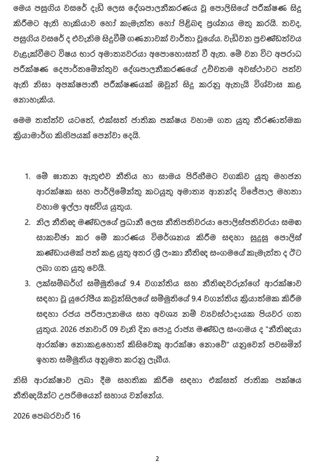 නීතිය හා සාමය පිරිහීම සම්බන්ධයෙන් අමාත්ය ආනන්ද විජේපාල මහතා වගකිව යුතු බවද එම නිවේදනයේ වැඩිදුරටත් සඳහන් වනවා.