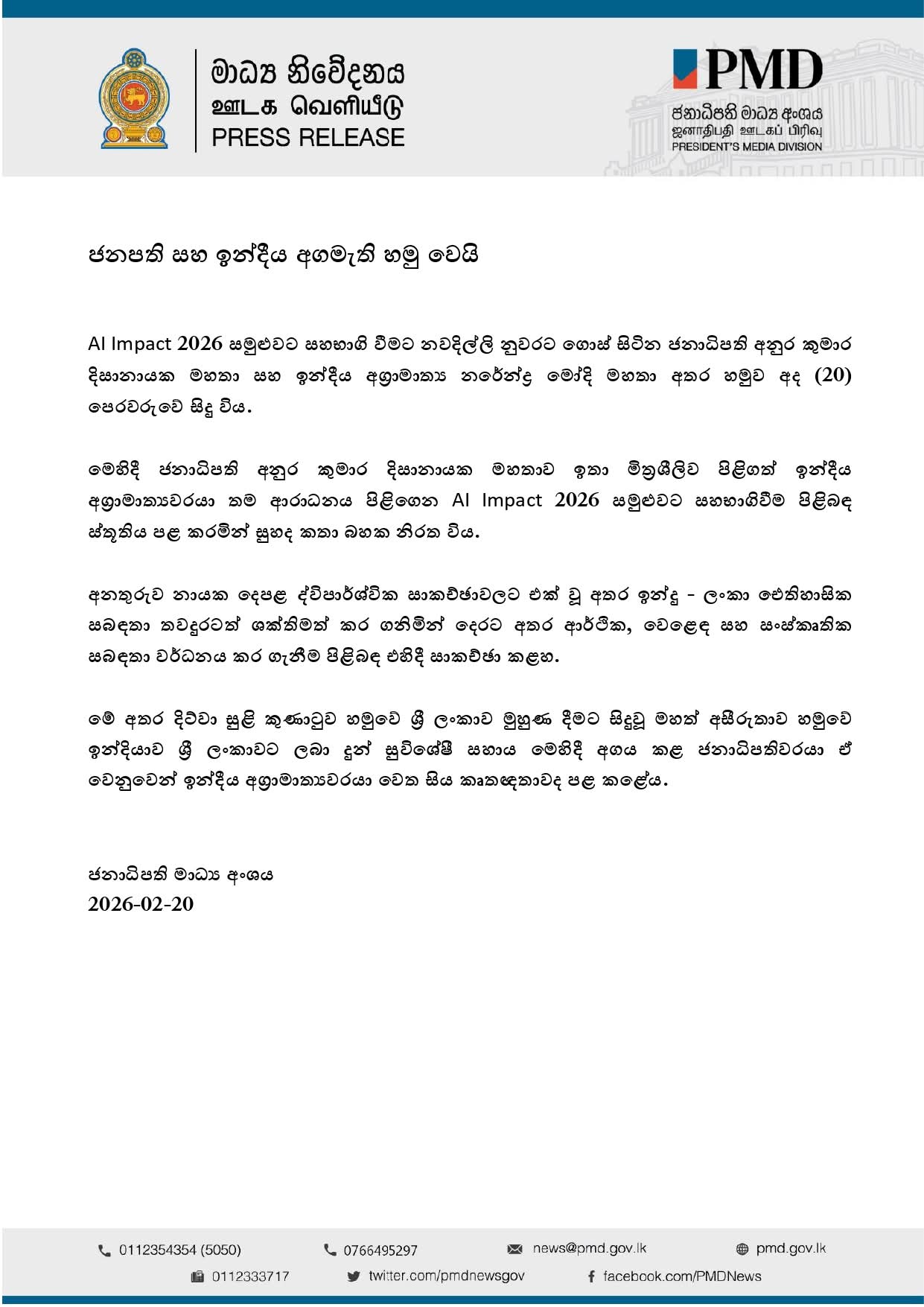 මේ සම්බන්ධයෙන් ජනාධිපති මාධ්ය අංශය නිකුත් කළ නිවේදනය පහතින්,