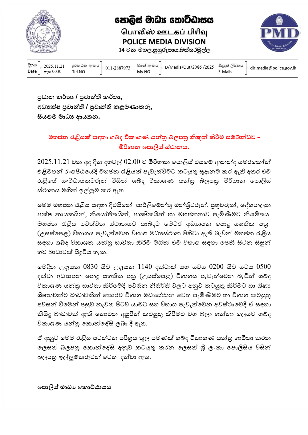 නුගේගොඩ අද (21) පැවැත්වෙන රැළියේ ශබ්ද විකාශන යන්ත්ර භාවිතයේදී උසස් පෙළ විභාගයට පෙනී සිටින දරුවන්ට බාධාවක් ඇති නොවන අයුරින් කටයුතු කරන ලෙස දැනුම්දී තිබෙනවා.