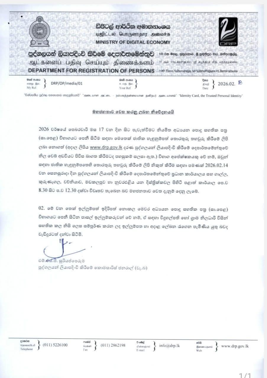 2026 පෙබරවාරි මස 17වනදා සිට පැවැත්වීමට නියමිත අධ්යන පොදු සහතික පත්ර සාමාන්ය පෙළ විභාගයට පෙනී සිටීම සඳහා මෙතෙක් ජාතික හැඳුනුම්පත් තොරතුරු තහවුරු කිරීමේ ලිපි ලබා නොගත් පාර්ශවයන් සඳහා පුද්ගලයන් ලියාපදිංචි කිරීමේ දෙපාර්තමේන්තුව විශේෂ නිවේදනයක් නිකුත් කර තිබෙනවා.
