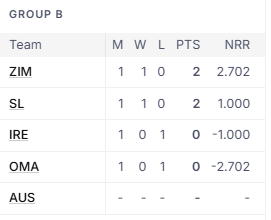 ඒ නුව සිම්බාබ්වේ කණ්ඩායම ප්රසාද ලකුණු 2ක් සහ ශුද්ධ දල ලකුණු ලබා ගැනීමේ වේගය 2.702ක් තබා ගනිමින් එහි පෙරමුණ හිමි කරගෙන තිබෙනවා.