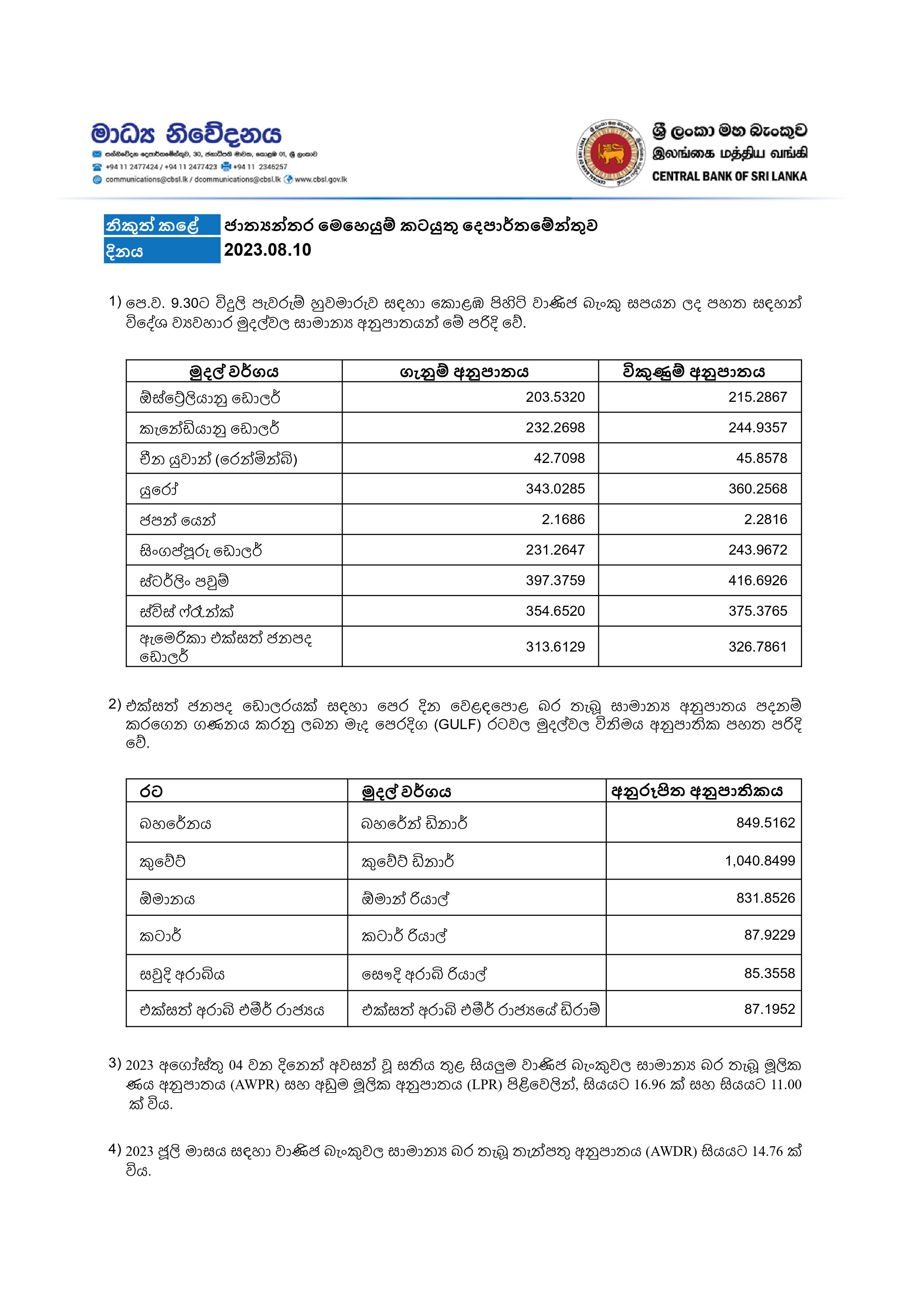 ශ්රී ලංකා මහ බැංකුව අද නිකුත් කළ විනිමය අනුපාත අනුව එක්සත් ජනපද ඩොලරයක ගැණුම් අනුපාතිකය රුපියල් 313.61 ක් ලෙස දැක්වෙන අතර විකුණුම් අගය රුපියල් 326.78 ක් ලෙස සටහන් වනවා.