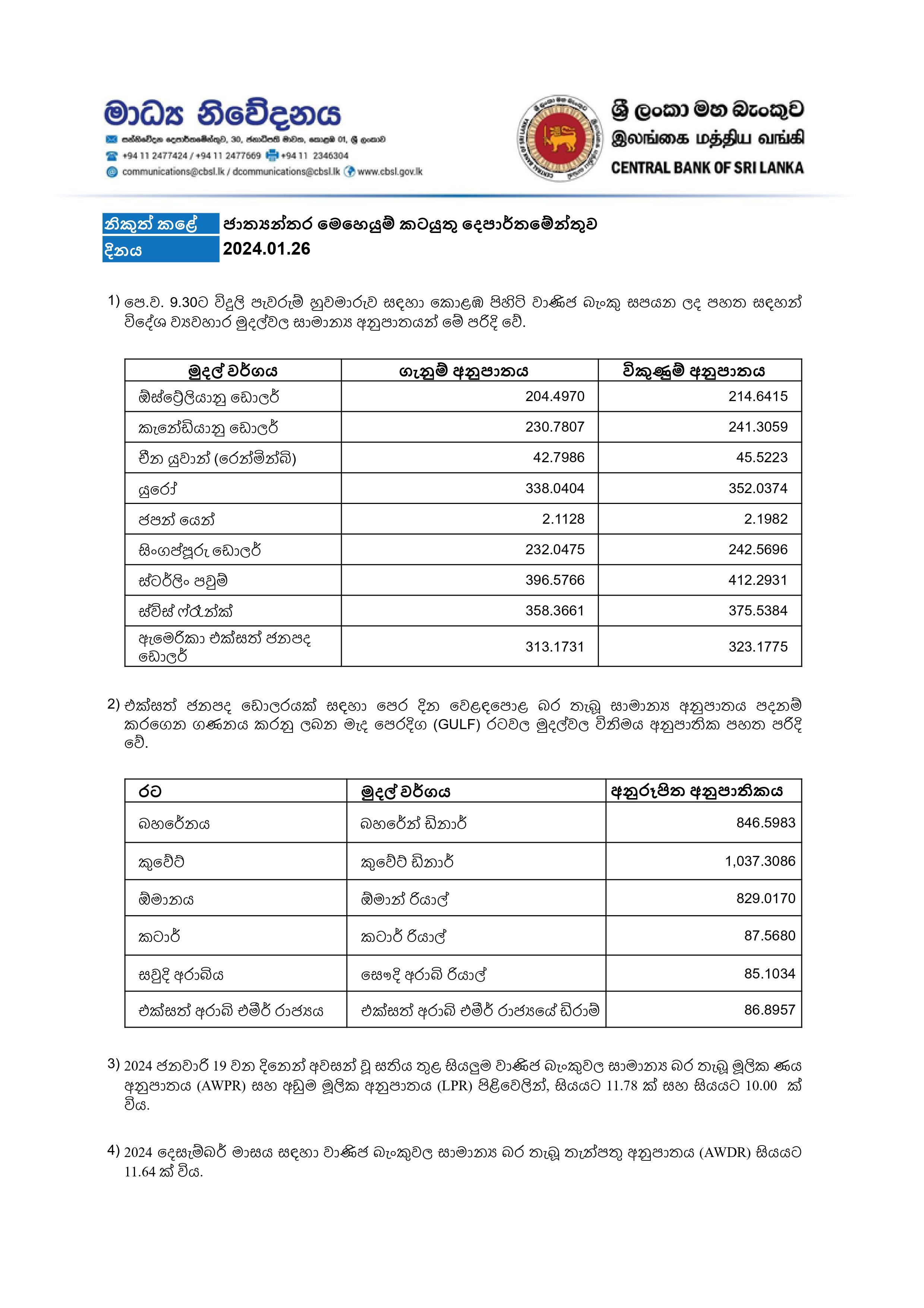 ශ්රී ලංකා මහ බැංකුව අද පෙරවරුවේ නිකුත් කළ විනිමය අනුපාතවලට අනුව එක්සත් ජනපද ඩොලරයක ගැණුම් අනුපාතිකය රුපියල් 313.17 ක් වූ අතර විකුණුම් අගය රුපියල් 322.17 ක් ලෙස සටහන් වනවා.