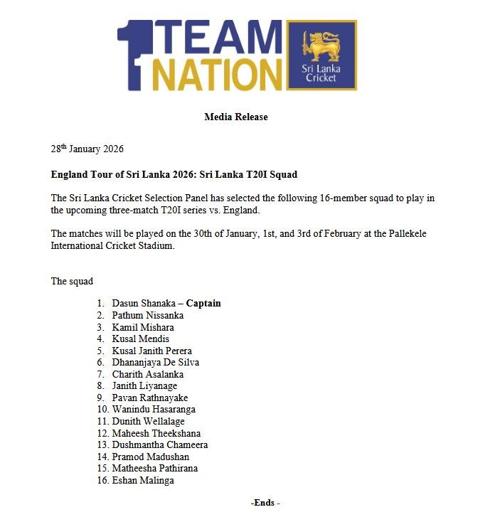 එංගලන්ත කණ්ඩායමට එරෙහිව පැවැත්වීමට නියමිත T20 තරගාවලිය සඳහා වන ශ්රී ලංකා සංචිතය නම් කර තිබෙනවා. එම සංචිතය පහතින්,