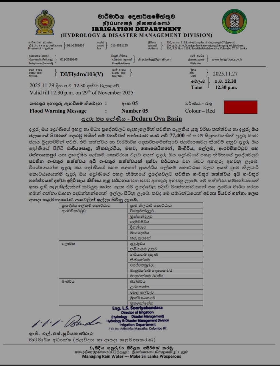 රතු නිවේදනයක් නිකුත් කරමින් වාරිමාර්ග දෙපාර්තමේන්තුව සඳහන් කළේ ඉදිරි පැය කිහිපය තුළ එම ප්රදේශයේ පවතින ගංවතුර තත්ත්වය අධි ගංවතුර තත්ත්වයක් දක්වා වර්ධනය වන බවයි.