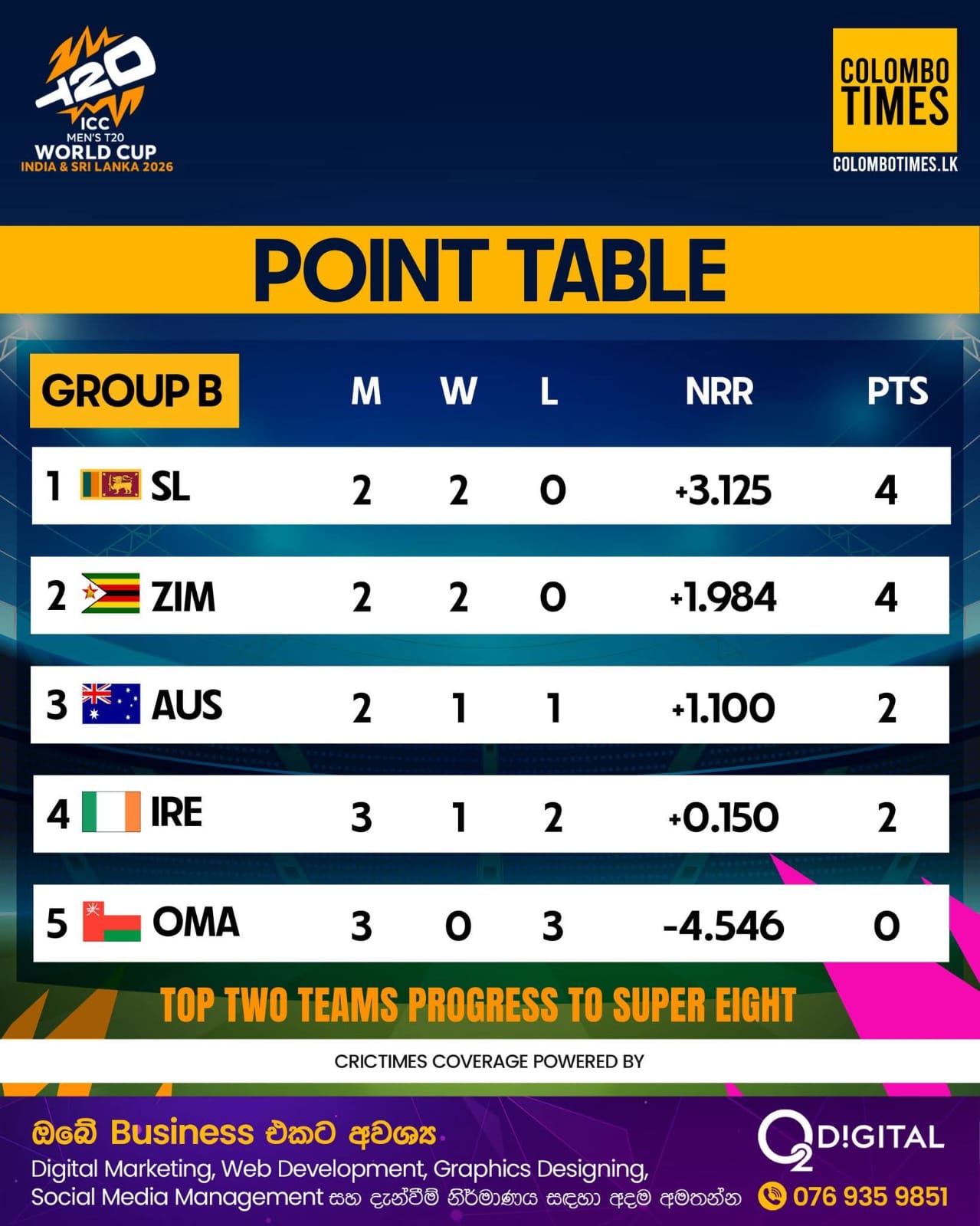 ඒ අනුව ශ්රී ලංකා කණ්ඩායම අද තරගය ජයග්රහණය කළහොත් සුපිරි 8දෙනාගේ තරග වටයේ සිය ස්ථානය තහවුරු කර ගැනීමට සමත් වනවා.
