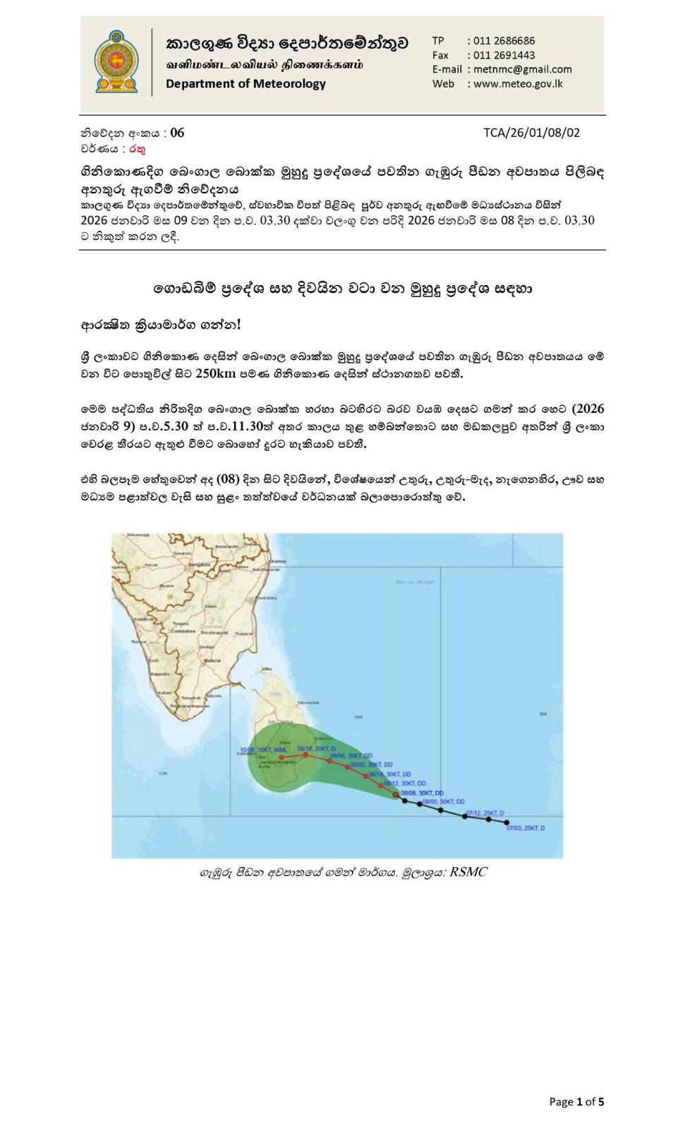 එම දෙපාර්තමේන්තුව සඳහන් කළේ එය හෙට (09) පස්වරු 5.30 සිට රාත්රී 11.30 දක්වා කාලය තුළදී හම්බන්තොට සහ කල්මුණේ අතර ශ්රී ලංකා වෙරළ තීරය හරහා ගමන් කිරීමට බොහෝදුරට ඉඩ ඇති බවයි.