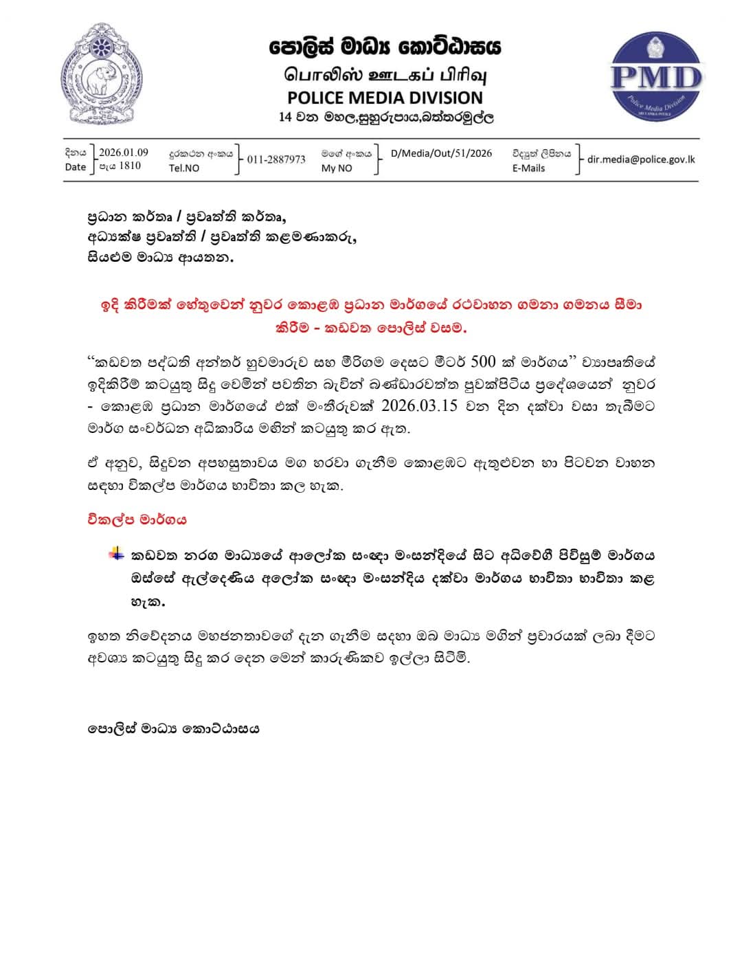 මෙම මාර්ගය මාර්තු 15වනදා දක්වා වසා තැබෙන බවයි වාර්තා වන්නේ.