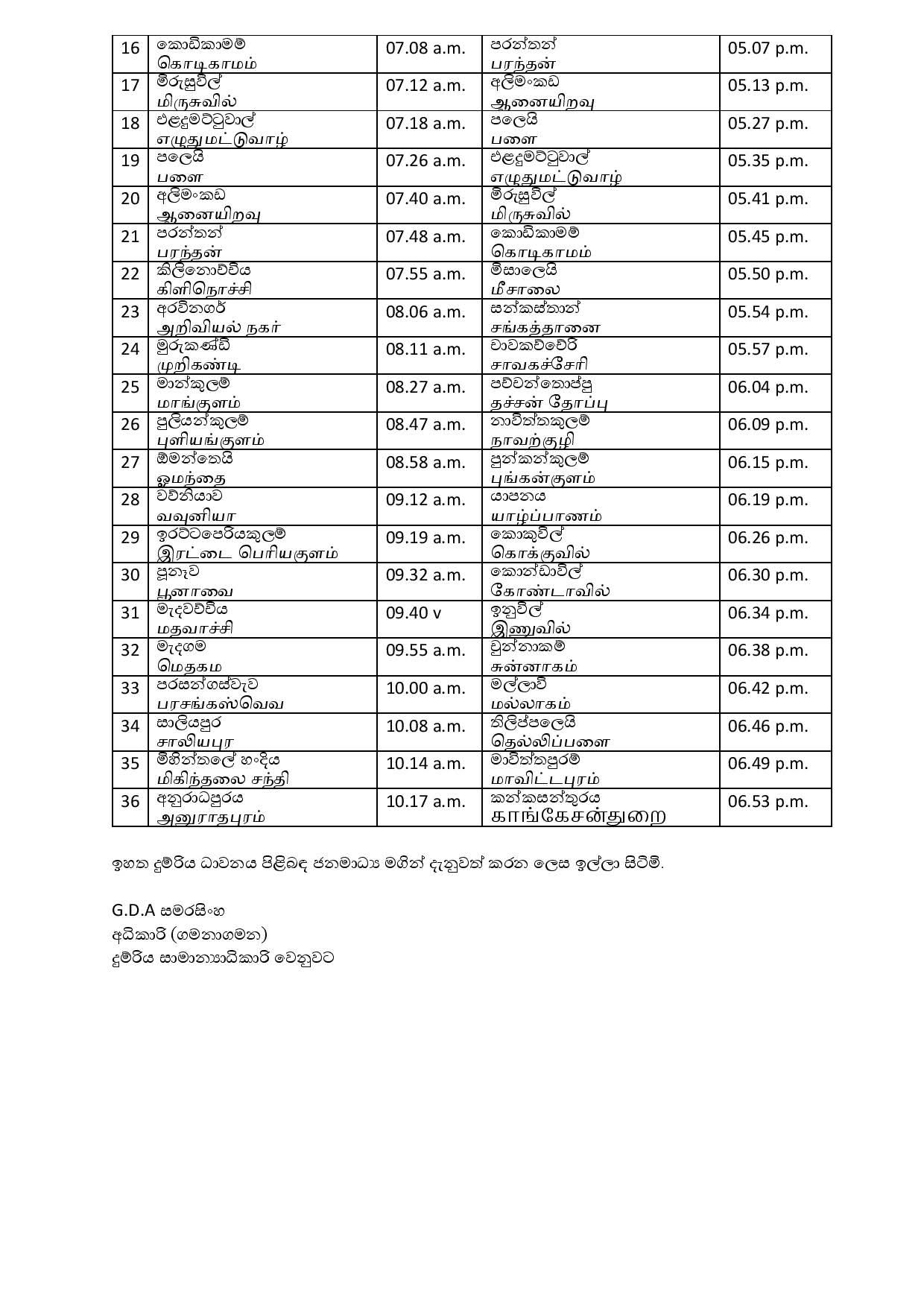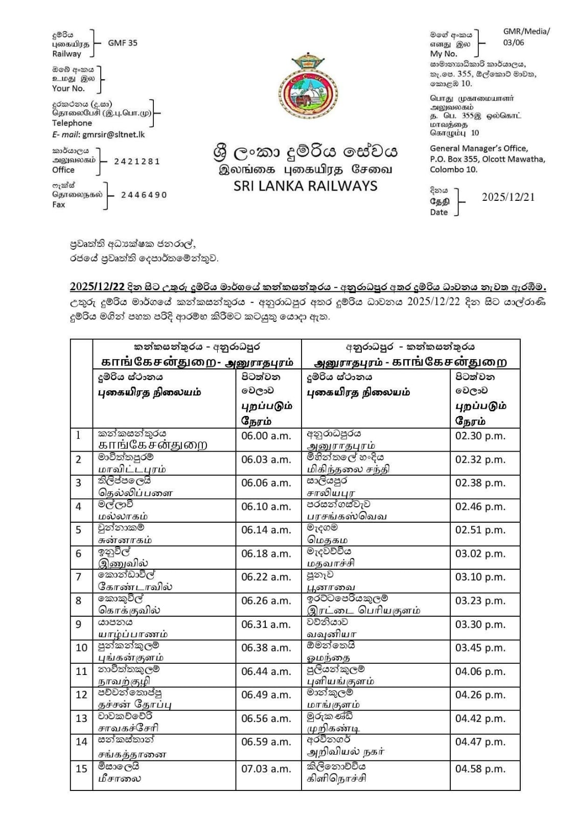 ඒ අනුව දිනපතා කන්කසන්තුරය සිට අනුරාධපුරය දුම්රිය සේවා කාල සටහන මෙන්ම අනුරාධපුරය සිට කන්කසන්තුරය දක්වා දුම්රිය සේවා කාල සටහන පහතින්,