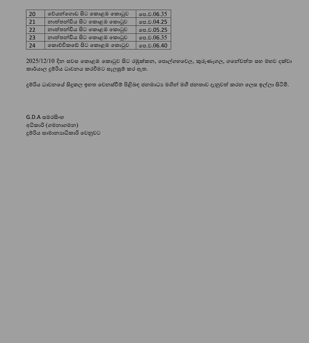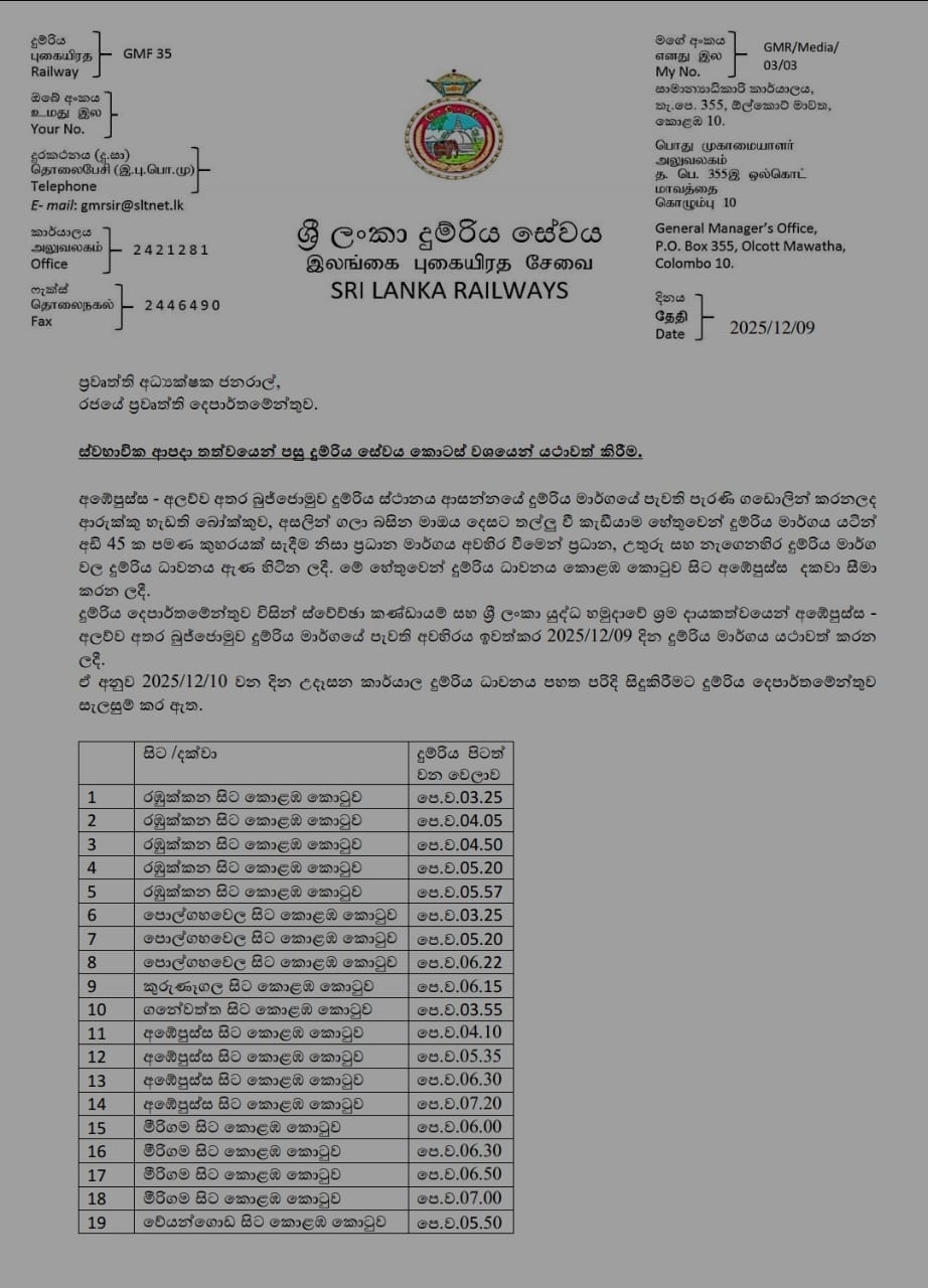 දුම්රිය දෙපාර්තමේන්තුව සඳහන් කළේ ගනේවත්ත, කුරුණෑගල, පොල්ගහවෙල සහ රඹුක්කන සිට කාර්යාල දුම්රිය ධාවනය කරන බවයි.
