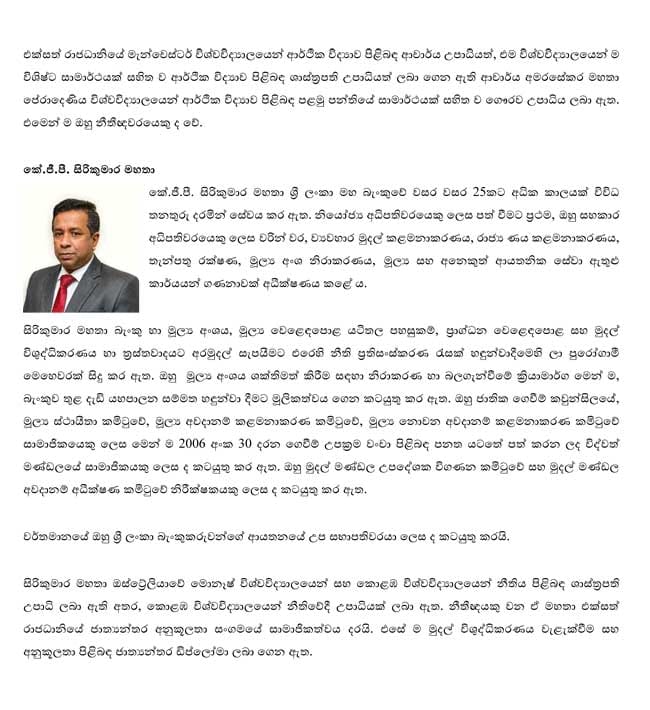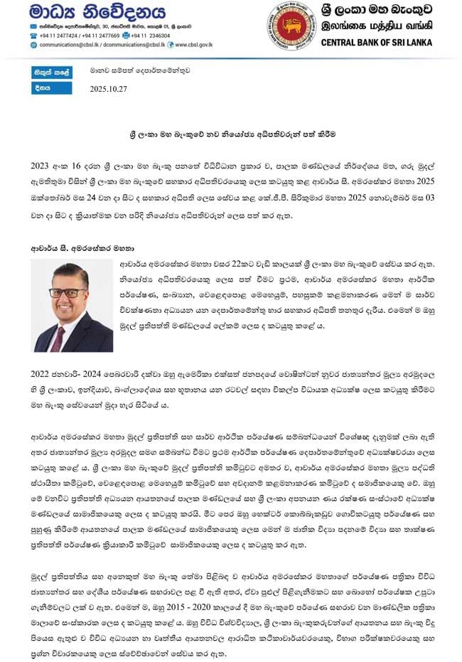 ඒ අනුව ශ්රී ලංකා මහ බැංකුවේ සහකාර අධිපතිවරයෙක් ලෙස කටයුතු කළ ආචාර්ය සී. අමරසේකර 2025 ඔක්තෝබර් මස 24වනදා සිට ද සහකාර අධිපති ලෙස සේවය කළ කේ.ජී.පී. සිරිකුමාර 2025 නොවැම්බර් මස 03වනදා සිට ද ක්රියාත්මක වන පරිදි නියෝජ්ය අධිපතිවරුන් ලෙස පත් කර තිබෙනවා.