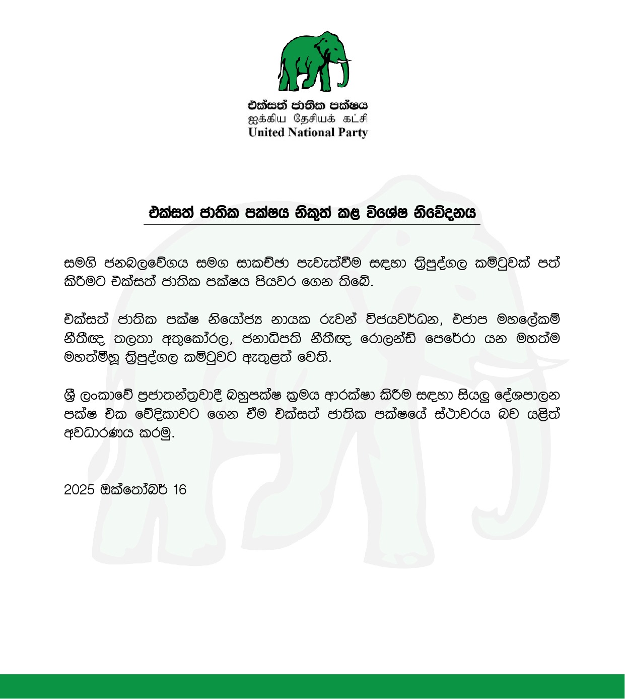 සමගි ජන බලවේගය සමඟ සාකච්ඡා කිරීමට ත්රිපුද්ගල කමිටුවක් පත් කිරීමට එක්සත් ජාතික පක්ෂය තීරණය කර තිබෙනවා. විශේෂ නිවේදනයක් නිකුත් කරමින් එම පක්ෂය මේ බව සඳහන් කළා.එම නිවේදනය පහතින්,(colombotimes.lk)