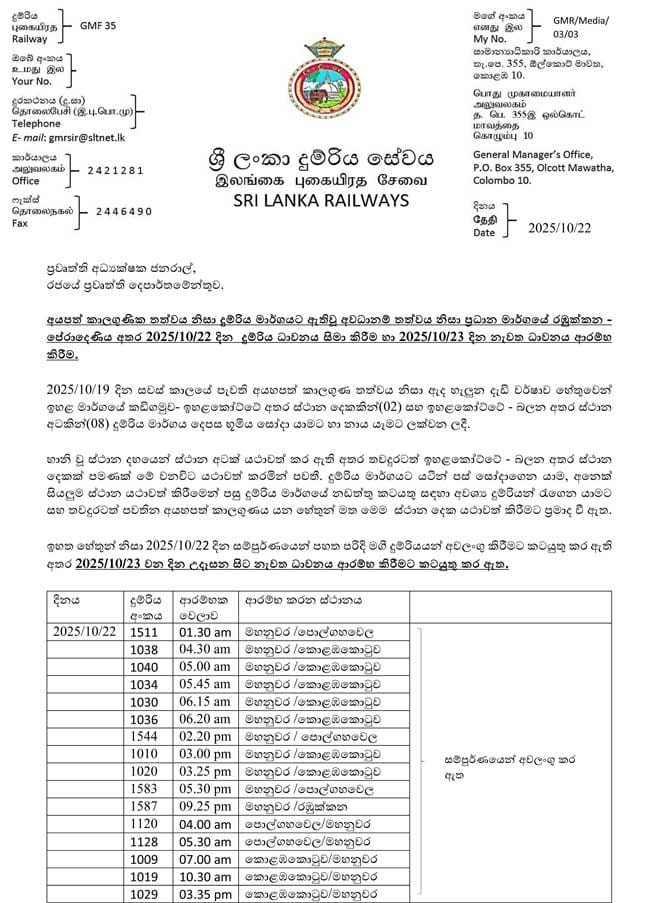 ඒ අනුව මහනුවර සිට කොළඹ කොටුව සහ කොළඹ කොටුවේ සිට මහනුවර බලා ධාවනය වන දුම්රිය කිහිපයක් මෙලෙස යළි ධාවනයට එක් කර ඇති බවයි වාර්තා වන්නේ.