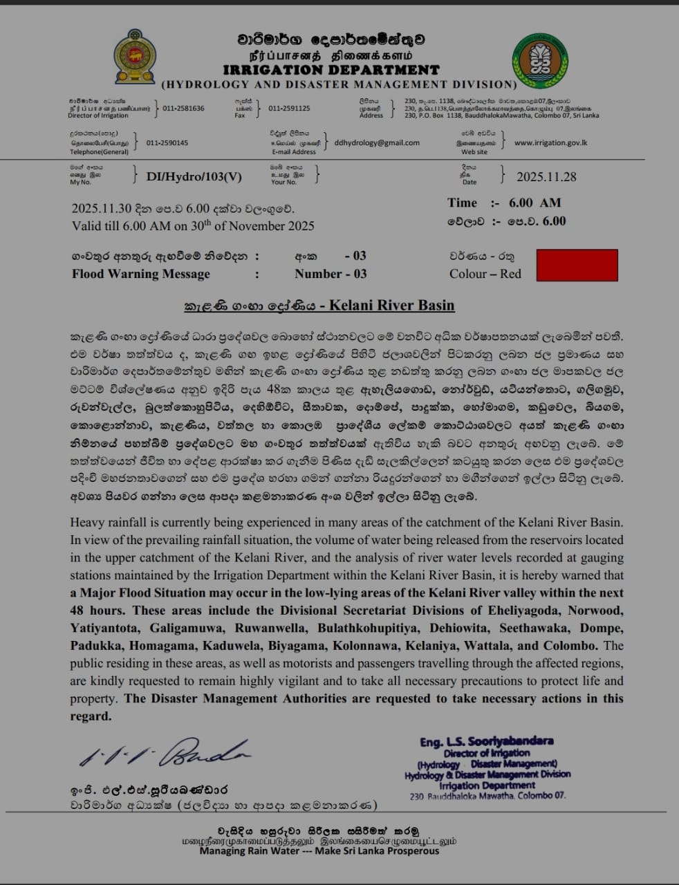 වාරිමාර්ග දෙපාර්තමේන්තුව සඳහන් කළේ ඉදිරි පැය 48ක කාලය තුළ ඇහැලියගොඩ, නෝර්වුඩ්, යටියන්තොට, ගලිගමුව, රුවන්වැල්ල, බුලත්කොහුපිටිය, දෙහිඕවිට, සීතාවක, දොම්පේ, පාදුක්ක, හෝමාගම, කඩුවෙල, බියගම, කොලොන්නාව, කැලණිය, වත්තල හා කොළඹ ප්රාදේශීය ලේකම් කොට්ඨාසවලට අයත් කැලණි ගංගා නිම්නයේ පහත්බිම් ප්රදේශවලට මෙලෙස මහ ගංවතුර තත්ත්වයක් ඇතිවිය හැකි බවට අනතුරු ඇඟවීම් නිකුත් කර තිබෙන බවයි.