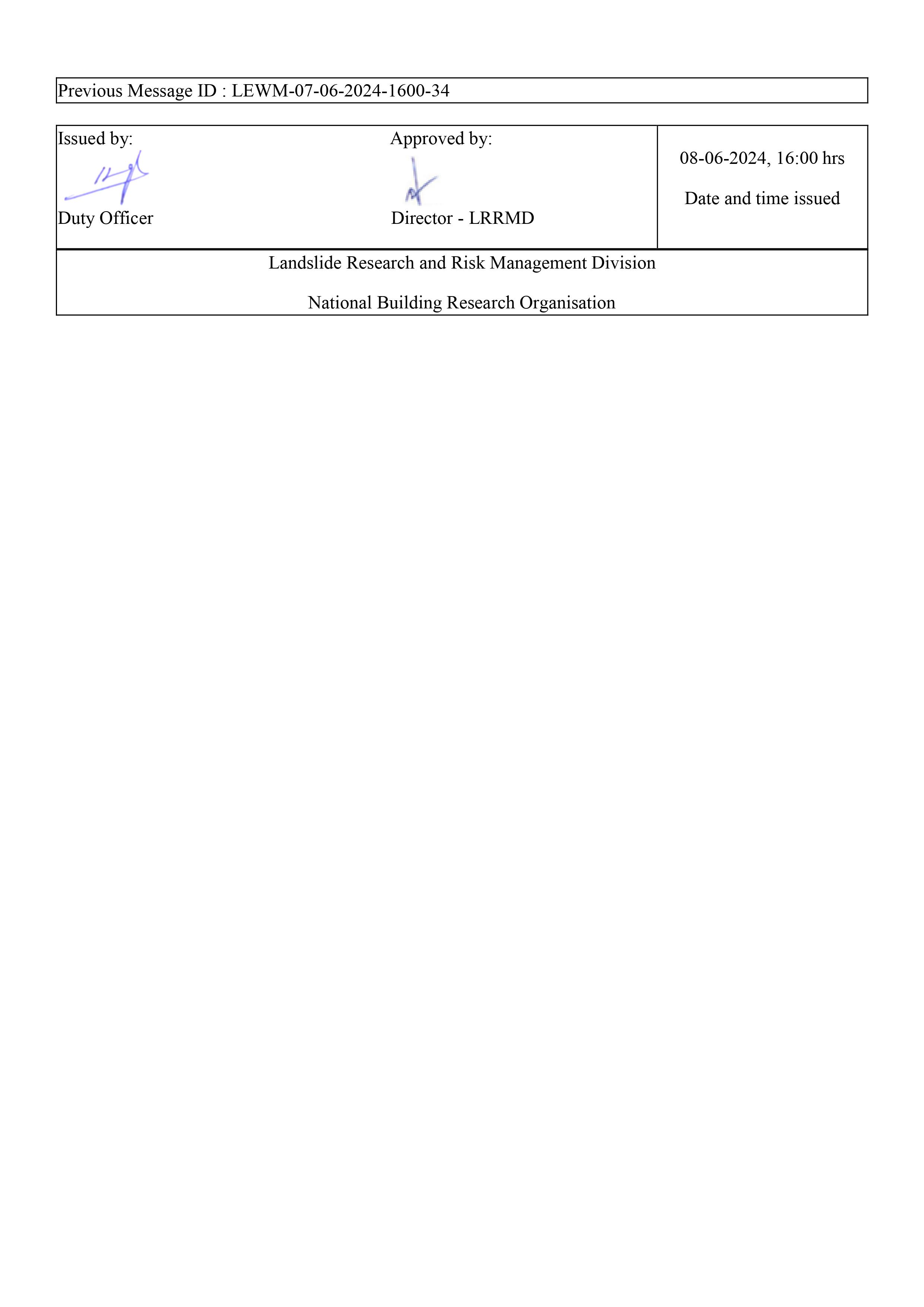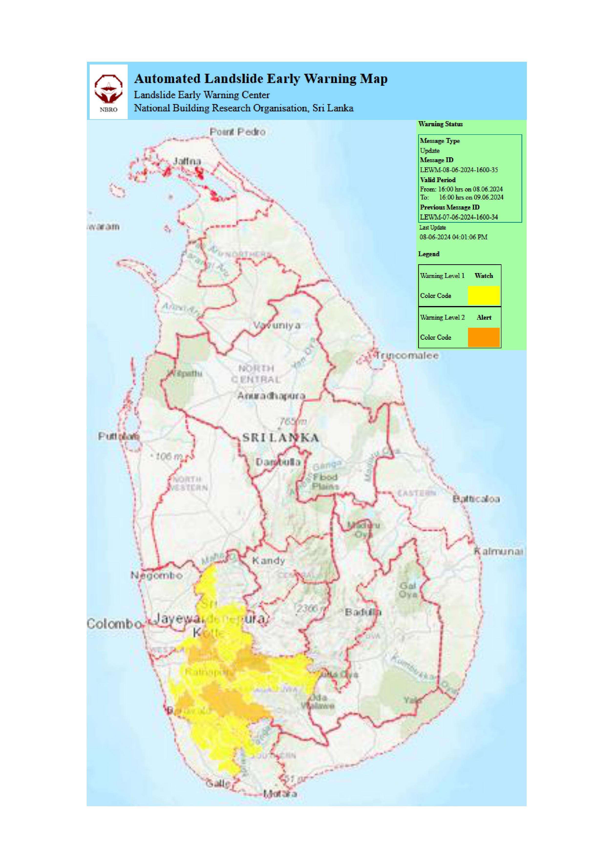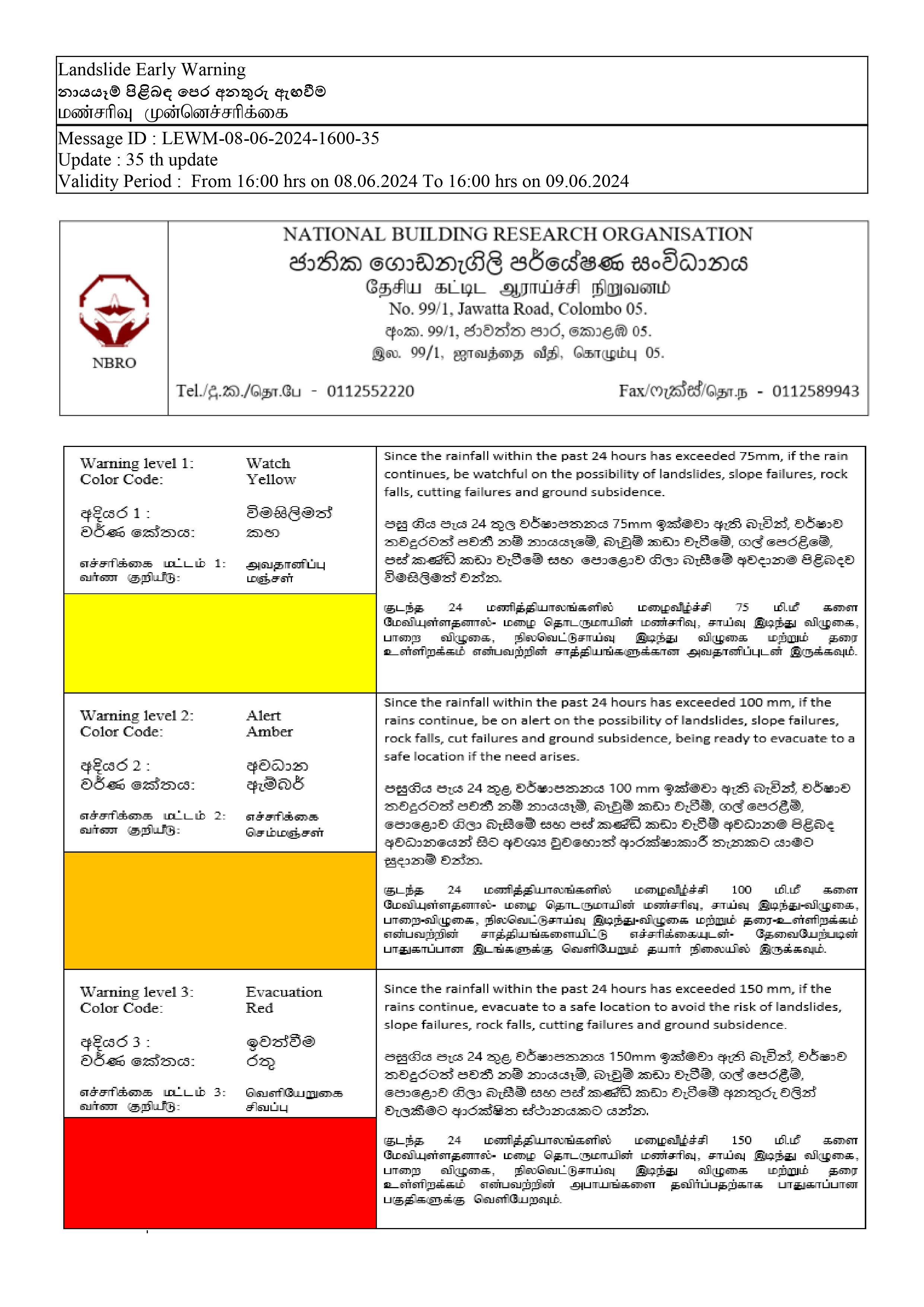 ජාතික ගොඩනැගිලි පර්යේෂණ සංවිධානය විසින් නායයෑම් පිළිබඳ පෙර අනතුරු ඇඟවීමේ නිවේදනයක් නිකුත් කර තිබෙනවා.