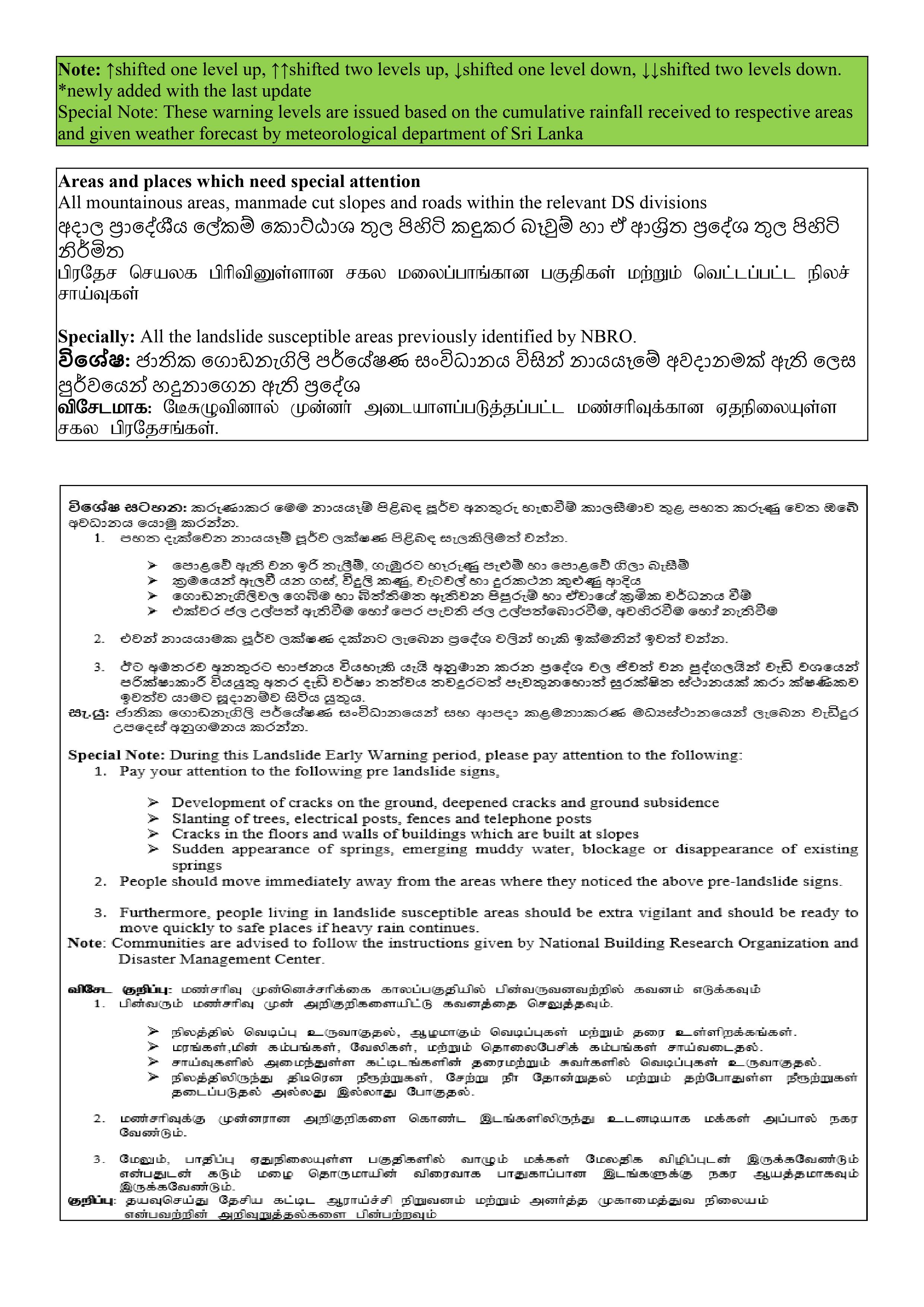 ඒ අනුව නායයෑමේ අවදානම පැවතිය හැකි ප්රදේශ සහ සැළකිලිමත් විය යුතු කරුණු සම්බන්ධයෙන් දැනුවත් කිරීමක් එම නිවේදනය මඟින් සිදු කර තිබෙනවා.