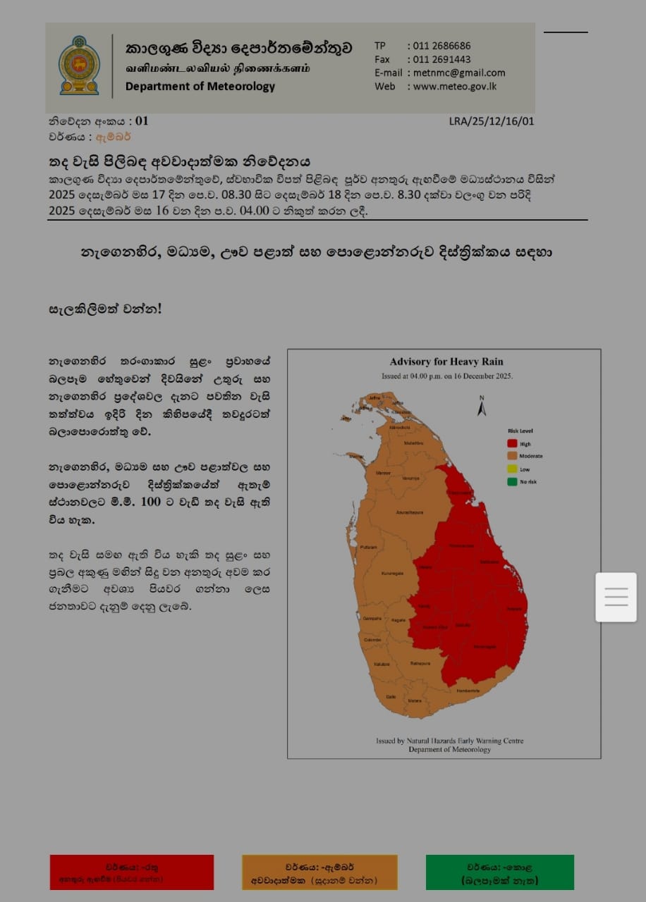 එම නිවේදනයේ සඳහන් වන්නේ නැගෙනහිර, මධ්යම, ඌව පළාත් සහ පොළොන්නරුව දිස්ත්රික්කය සඳහා සැලකිලිමත් වන ලෙසයි.