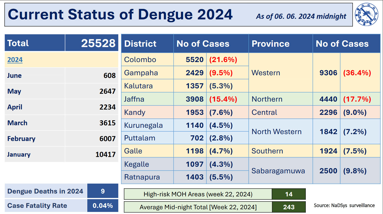 2024 වර්ෂයේ ජුනි මාසයේ 01 දා සිට මේ දක්වා ඩෙංගු රෝගීන් 608 දෙනෙකු වාර්තා වී තිබෙනවා.