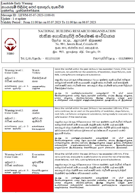 ජාතික ගොඩනැගිලි පර්යේෂණ සංවිධානය විසින් නිකුත් කරන ලද අනතුරු ඇඟවීම් රාත්රී 11 දක්වා ක්රියාත්මකයි.