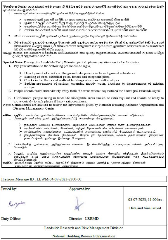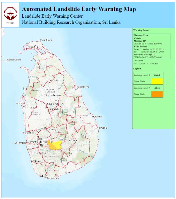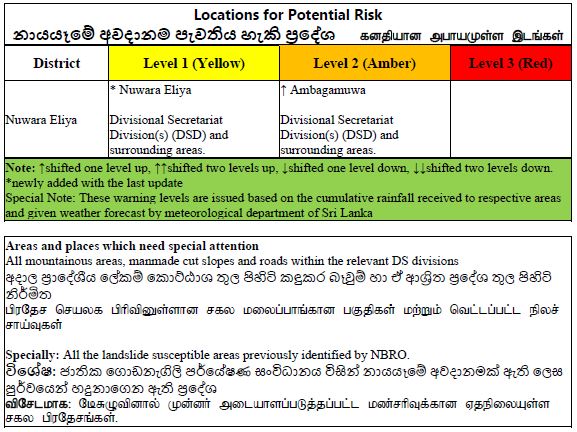 තවද, රත්නපුර දිස්ත්රික්කයේ නුවරඑළිය ප්රාදේශීය ලේකම් බල ප්රදේශයේ සහ ඇහැලියගොඩ ප්රාදේශීය ලේකම් බල ප්රදේශයේ පදිංචිකරුවන්ට 1 මට්ටමේ නායයෑම් අනතුරු ඇඟවීම් නිකුත් කර තිබෙනවා.