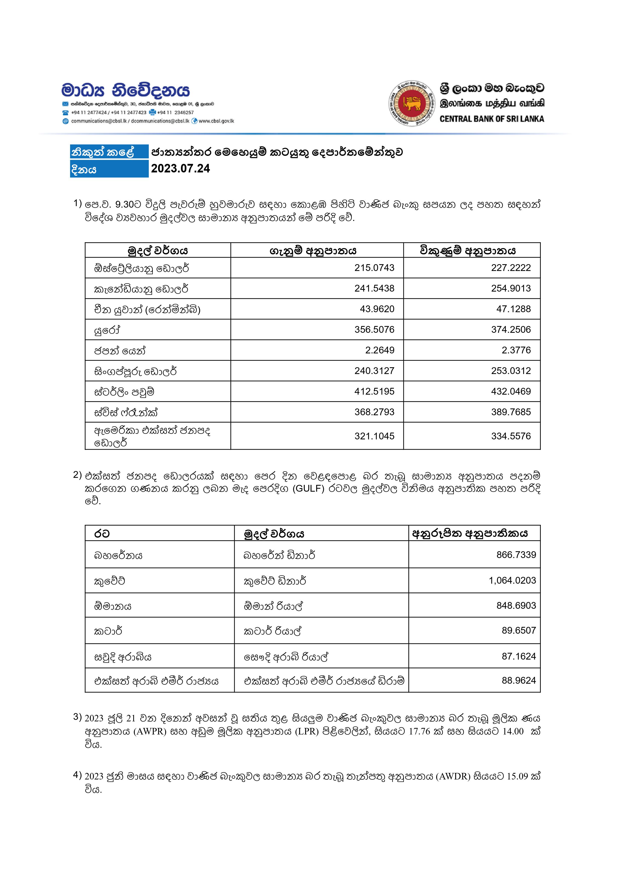ශ්රී ලංකා මහ බැංකුව විසින් අද (24) නිකුත් කළ විනිමය අනුපාතවලට අනුව එක්සත් ජනපද ඩොලරයක ගැනුම් අනුපාතිකය රුපියල් 321.10 ක් ලෙස දැක්වෙන අතර විකුණුම් අගය රුපියල් 334.55 ක් ලෙස සටහන් වනවා.