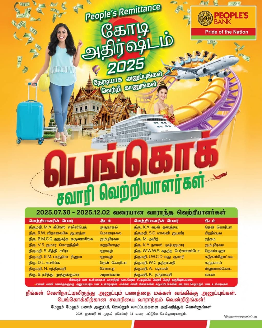 ஜூலை 30 முதல் டிசம்பர் 02 வரை வாராந்திர காலத்திற்கு People's Remittance 'வாசி கோடியய் ' பாங்காக் சவாரி போட்டியின் வெற்றியாளர்கள் அறிவிக்கப்பட்டுள்ளனர்.
